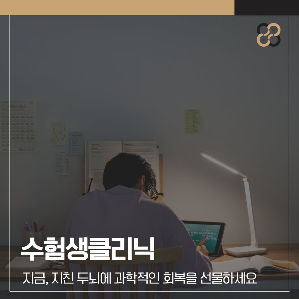수험생클리닉 지금, 지친 두뇌에 과학적인 회복을 선물하세요 수험 시즌이 다가오면 많은 학생들은 과중한 공부와 시험 스트레스로 인해 두뇌가 지칠 때가
